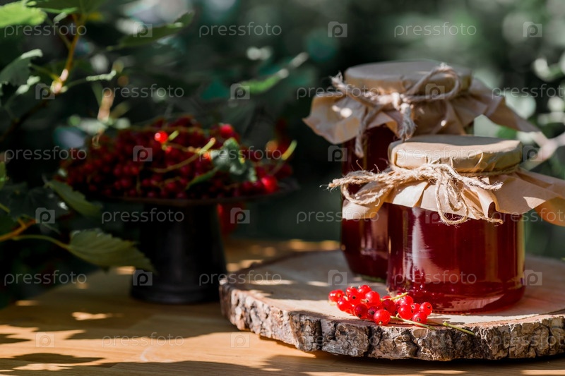 Домашнее полезное желе, варенье из красной смородины на фоне куста смородины. Подготовка банок. Сладости. Консервация и летний урожай