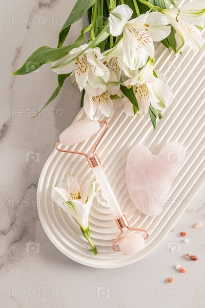 Косметический роликовый массажер из розового кварца, скребок гуаша и цветы астромерии лежат на белом подиуме в форме арки. Вид сверху. самостоятельное лечение