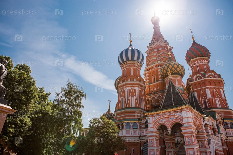 МОСКВА, РОССИЯ - 9 ИЮНЯ 2023 г.: Собор Василия Блаженного на Васильевском спуске на Красной площади в солнечный день на фоне ярко-голубого неба. Популярная туристическая достопримечательность Москвы