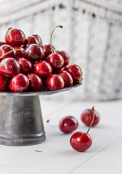 Фрукты и ягоды. Летнее время. Вкусные свежие вишни на стильном железном подносе в стиле ретро на белом столе. Место для текста
