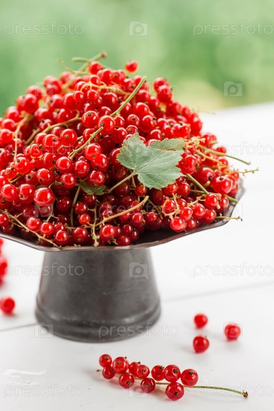 Фрукты и ягоды. Летнее время. Вкусная красная смородина на стильном железном подносе в стиле ретро на белом столе. Место для текста