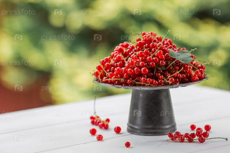 Фрукты и ягоды. Летнее время. Вкусная красная смородина на стильном железном подносе в стиле ретро на белом столе. Место для текста