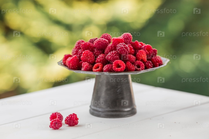 Фрукты и ягоды. Летнее время. Вкусная свежая малина на стильном железном подносе в стиле ретро на белом столе. Место для текста
