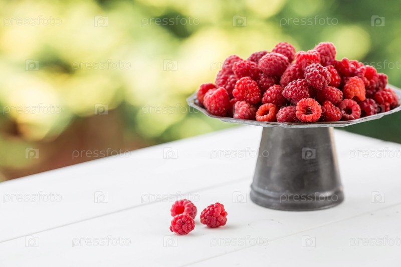 Фрукты и ягоды. Летнее время. Вкусная свежая малина на стильном железном подносе в стиле ретро на белом столе. Место для текста