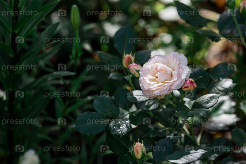 Красивые нежные пастельные розы с росой на рассвете. Красивый солнечный свет. Фоновое изображение зелено-розовое. Естественный, экологически чистый природный фон