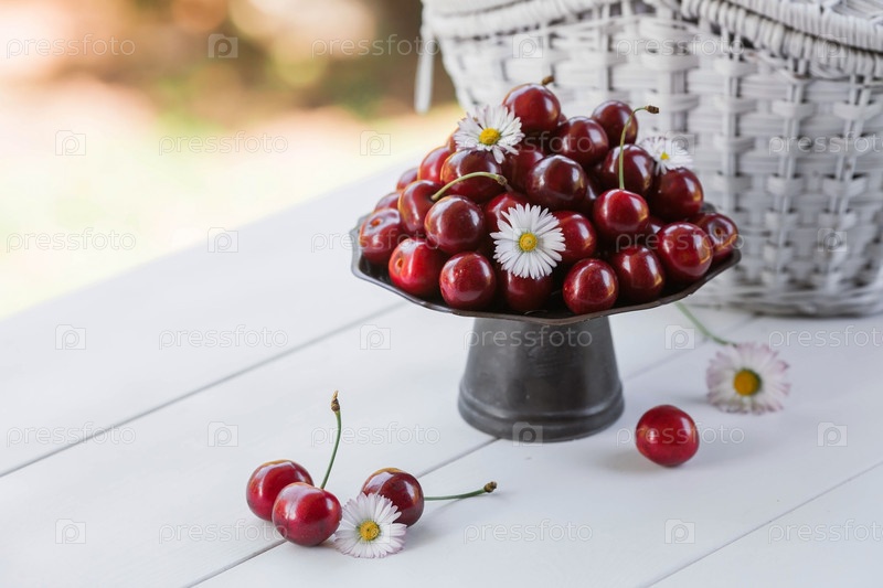 Фрукты и ягоды. Летнее время. Вкусные свежие вишни на стильном железном подносе в стиле ретро на белом столе. Место для текста