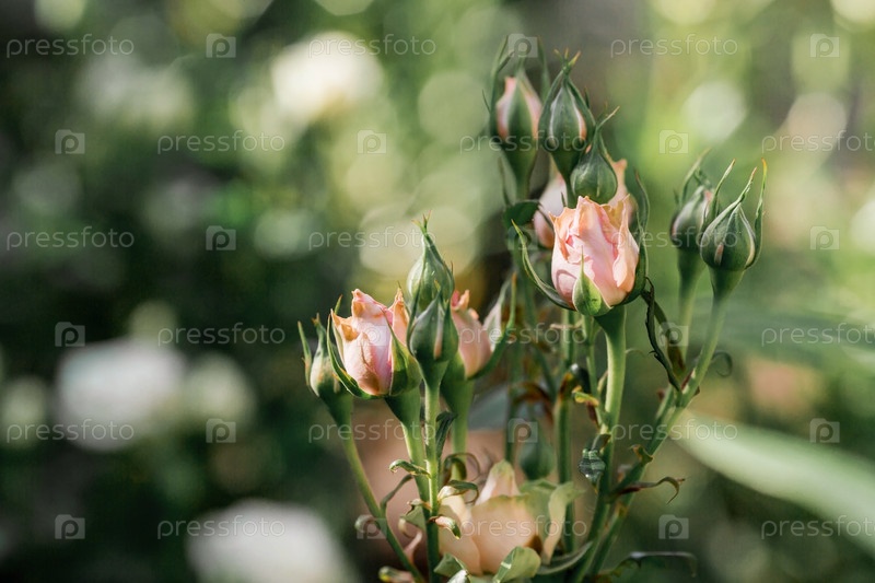 Красивые нежные пастельные розы с росой на рассвете. Красивый солнечный свет. Фоновое изображение зелено-розовое. Естественный, экологически чистый природный фон