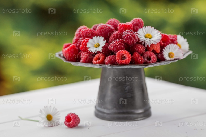 Фрукты и ягоды. Летнее время. Вкусная свежая малина на стильном железном подносе в стиле ретро на белом столе. Место для текста