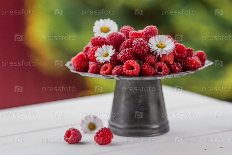 Фрукты и ягоды. Летнее время. Вкусная свежая малина на стильном железном подносе в стиле ретро на белом столе. Место для текста