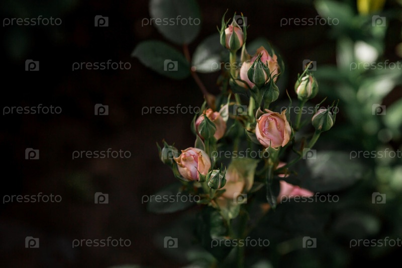 Красивые нежные пастельные розы с росой на рассвете. Красивый солнечный свет. Фоновое изображение зелено-розовое. Естественный, экологически чистый природный фон