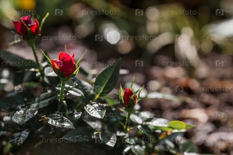 Красивые красные розы с росой на рассвете. Красивый солнечный свет. Фоновое изображение зелено-розовое. Естественный, экологически чистый природный фон