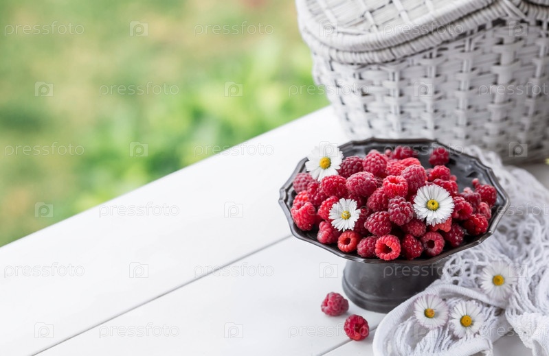 Фрукты и ягоды. Летнее время. Вкусная свежая малина на стильном железном подносе в стиле ретро на белом столе. Место для текста