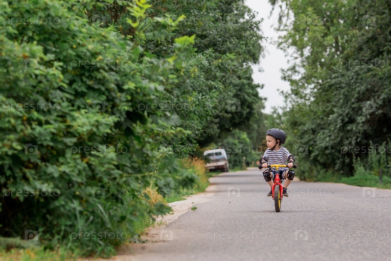 Веселый маленький мальчик катается на велосипеде в шлеме на улице. Счастливый ребенок занимается активным спортом. Защита. Страхование жизни и безопасность детей