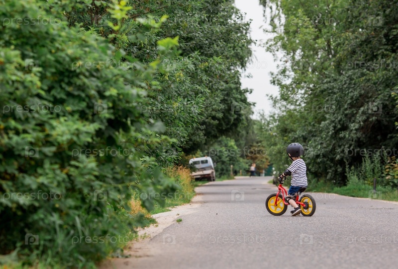 Веселый маленький мальчик катается на велосипеде в шлеме на улице. Счастливый ребенок занимается активным спортом. Защита. Страхование жизни и безопасность детей
