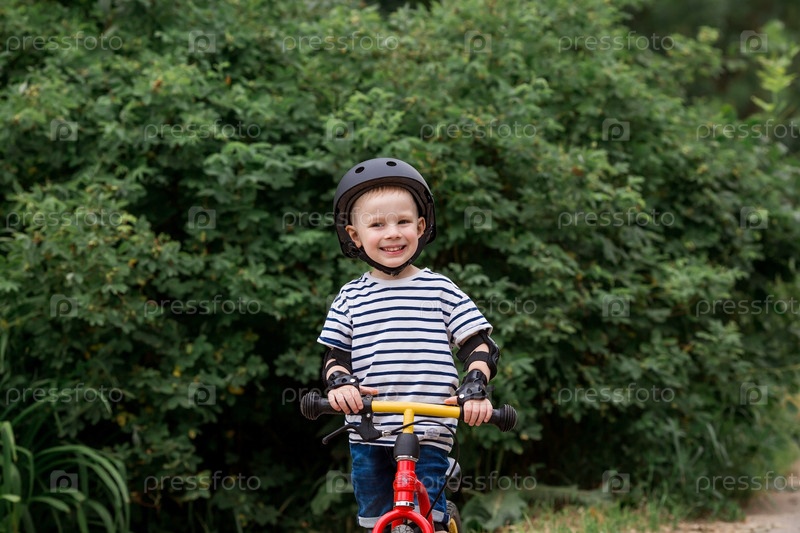 Веселый маленький мальчик катается на велосипеде в шлеме на улице. Счастливый ребенок занимается активным спортом. Защита. Страхование жизни и безопасность детей