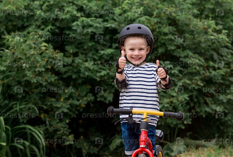 Веселый маленький мальчик катается на велосипеде в шлеме на улице. Счастливый ребенок занимается активным спортом. Защита. Страхование жизни и безопасность детей
