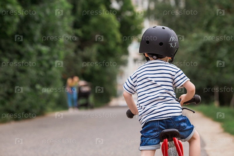 Веселый маленький мальчик катается на велосипеде в шлеме на улице. Счастливый ребенок занимается активным спортом. Защита. Страхование жизни и безопасность детей