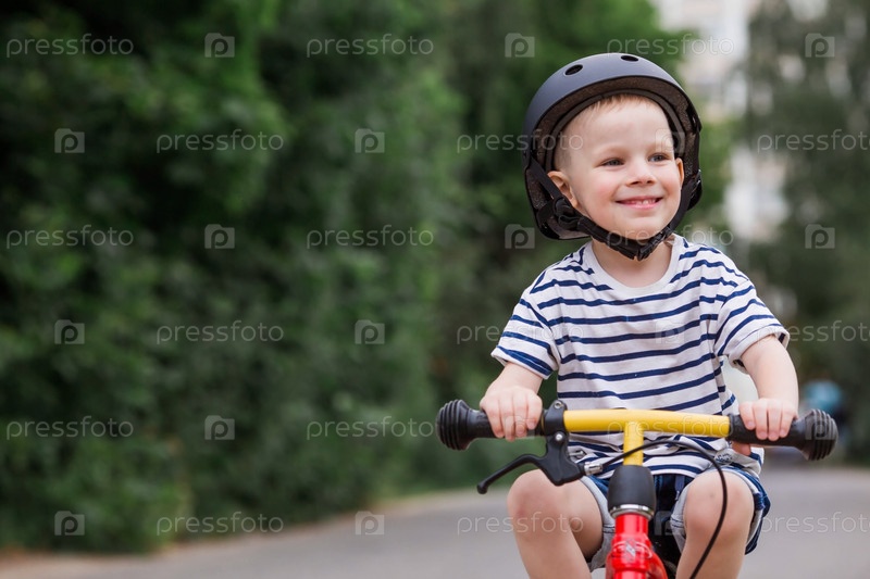 Веселый маленький мальчик катается на велосипеде в шлеме на улице. Счастливый ребенок занимается активным спортом. Защита. Страхование жизни и безопасность детей