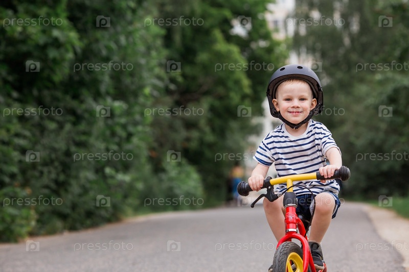 Веселый маленький мальчик катается на велосипеде в шлеме на улице. Счастливый ребенок занимается активным спортом. Защита. Страхование жизни и безопасность детей