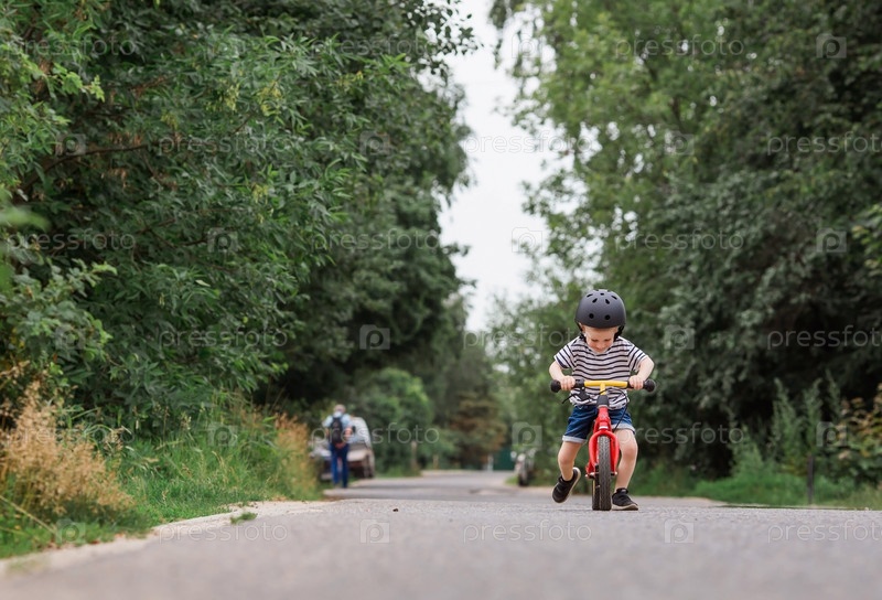 Веселый маленький мальчик катается на велосипеде в шлеме на улице. Счастливый ребенок занимается активным спортом. Защита. Страхование жизни и безопасность детей