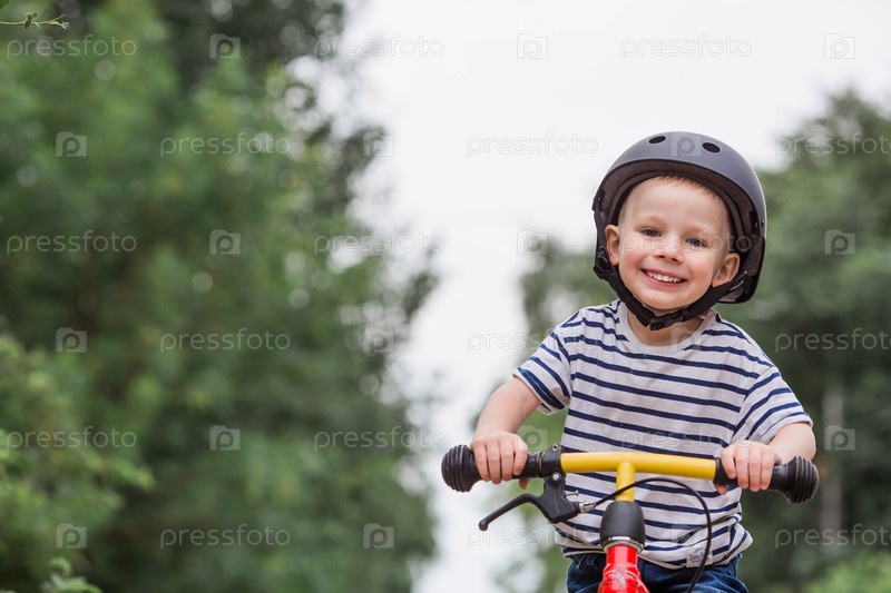 Веселый маленький мальчик катается на велосипеде в шлеме на улице. Счастливый ребенок занимается активным спортом. Защита. Страхование жизни и безопасность детей