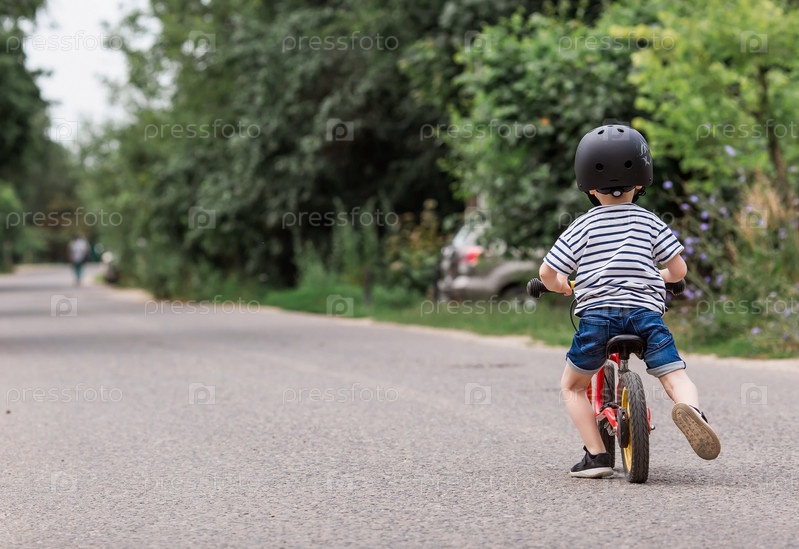 Веселый маленький мальчик катается на велосипеде в шлеме на улице. Счастливый ребенок занимается активным спортом. Защита. Страхование жизни и безопасность детей