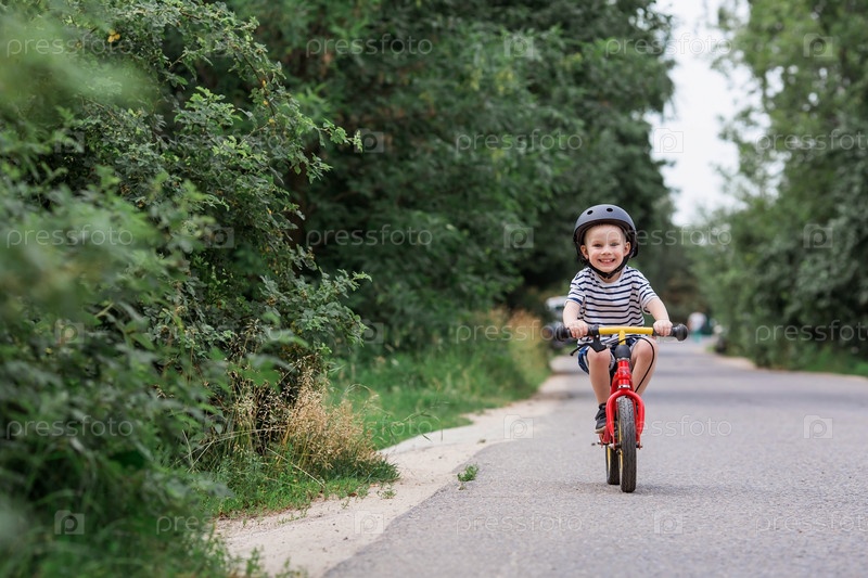 Веселый маленький мальчик катается на велосипеде в шлеме на улице. Счастливый ребенок занимается активным спортом. Защита. Страхование жизни и безопасность детей