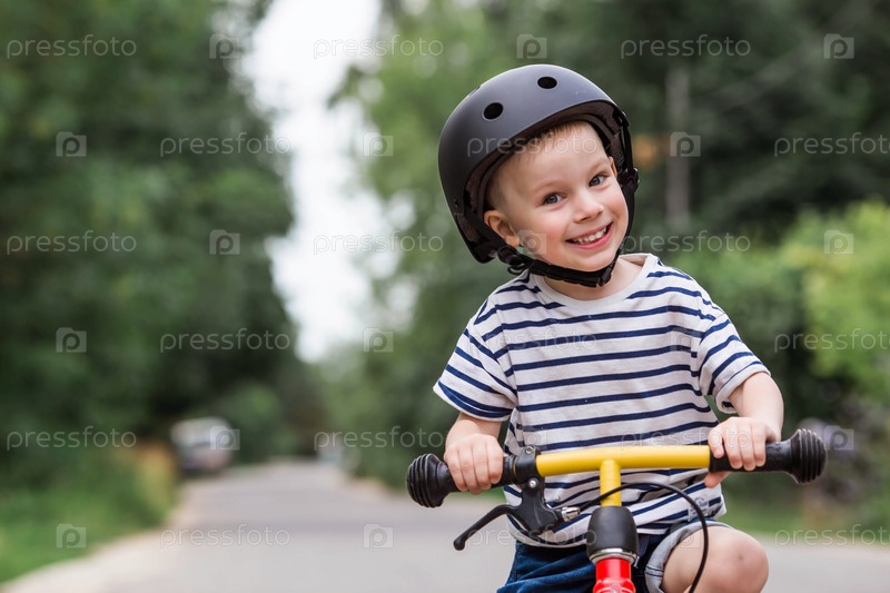 Веселый маленький мальчик катается на велосипеде в шлеме на улице. Счастливый ребенок занимается активным спортом. Защита. Страхование жизни и безопасность детей