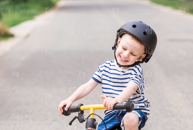Веселый маленький мальчик катается на велосипеде в шлеме на улице. Счастливый ребенок занимается активным спортом. Защита. Страхование жизни и безопасность детей