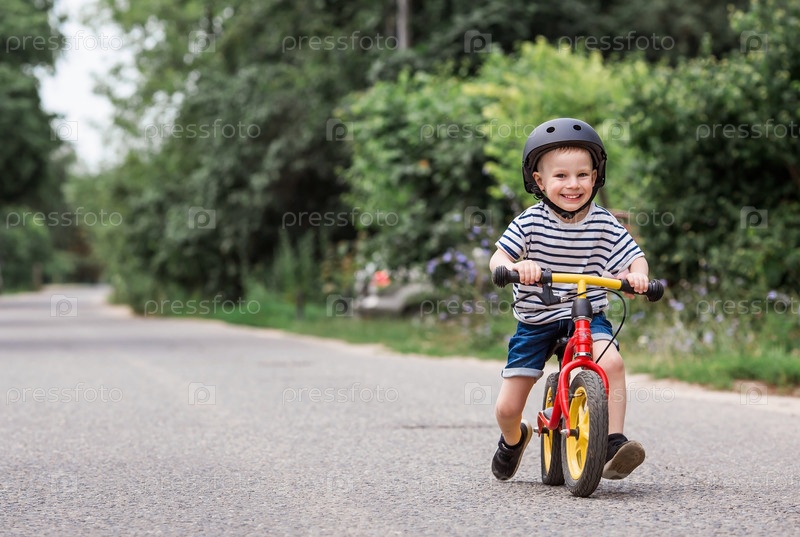 Веселый маленький мальчик катается на велосипеде в шлеме на улице. Счастливый ребенок занимается активным спортом. Защита. Страхование жизни и безопасность детей