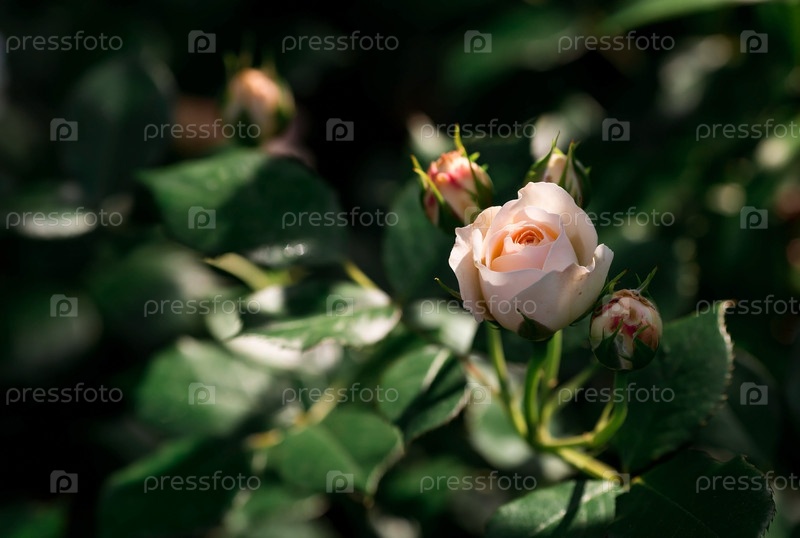 Красивые нежные пастельные розы с росой на рассвете. Красивый солнечный свет. Фоновое изображение зелено-розовое. Естественный, экологически чистый природный фон