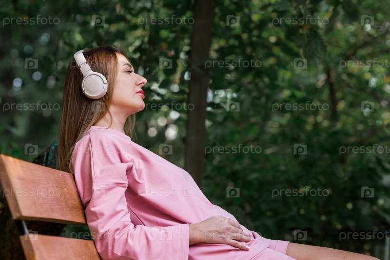 Молодая красивая женщина слушает музыку в наушниках с закрытыми глазами на скамейке в парке. Мир, гармония, расслабление и релаксация