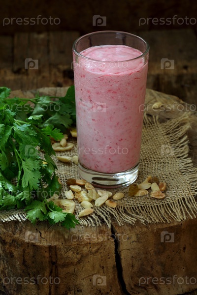 Смузи из спелой малины, йогурта и орехов в прозрачном стакане