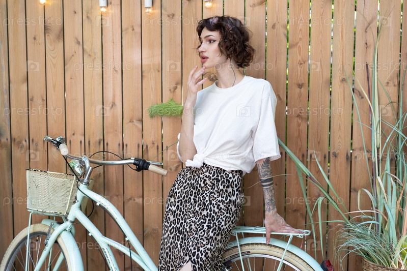 Молодая красивая женщина позирует на улице рядом с велосипедом