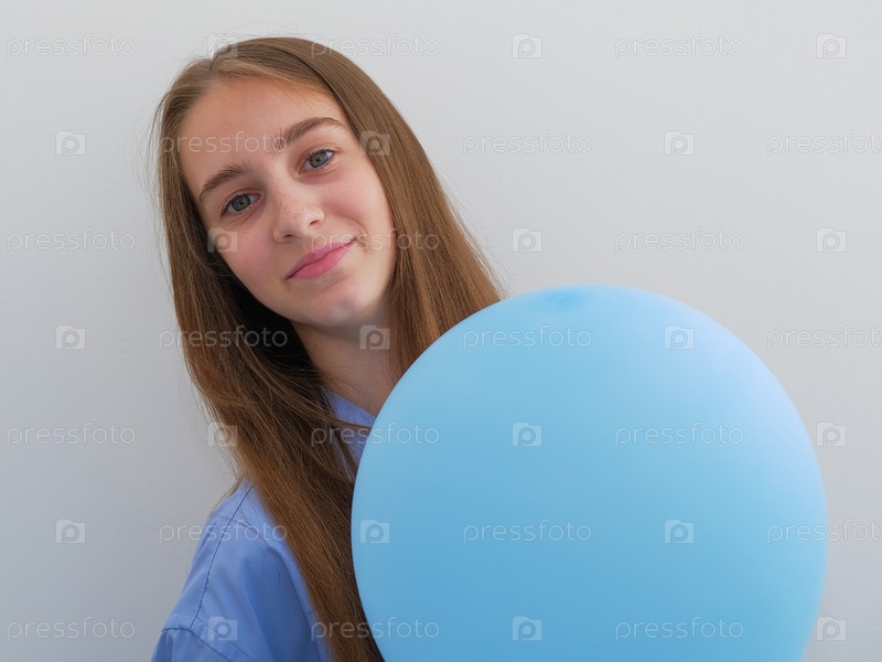 Красивая девочка с длинными волосами с голубым воздушным шариком