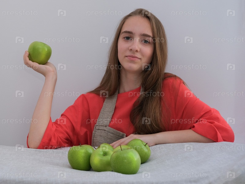 Красивая девочка с длинными волосами в красном платье с зелеными яблоками