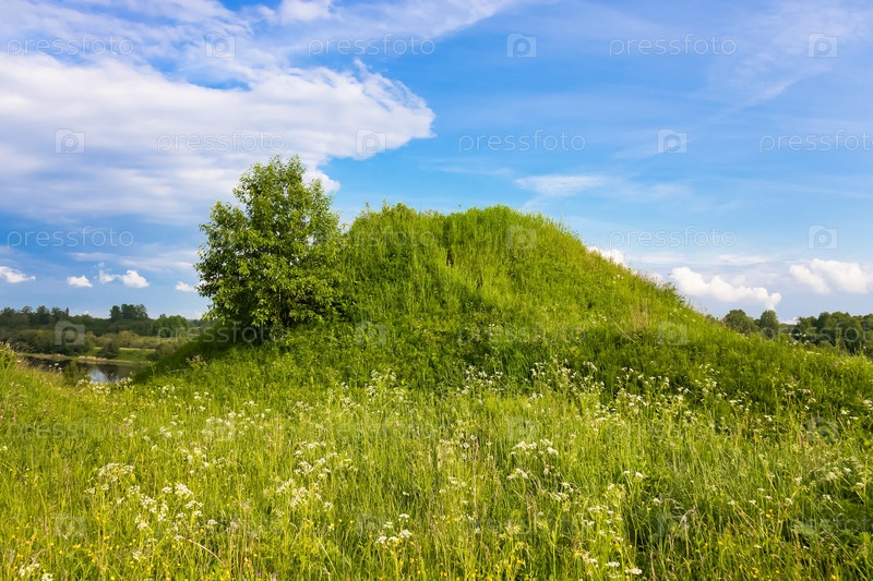 Пейзаж с холмом, поросшим зеленой травой под синим небом