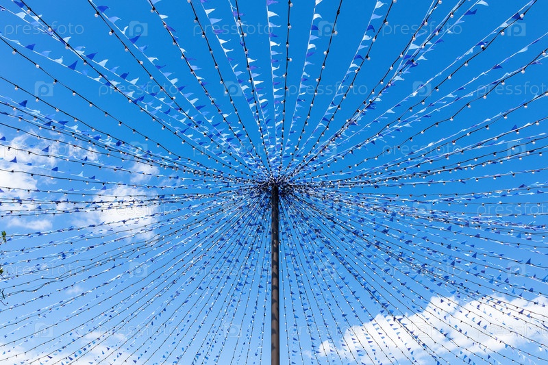 Уличное украшение на фоне неба, декор улицы в виде зонтика из гирлянд и синих и белых маленьких флажков