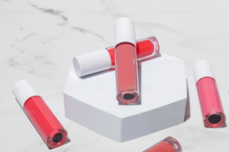 Пять ярких бутылочек жидкой помады или блеска для губ, расположенные на белом подиуме на мраморном фоне