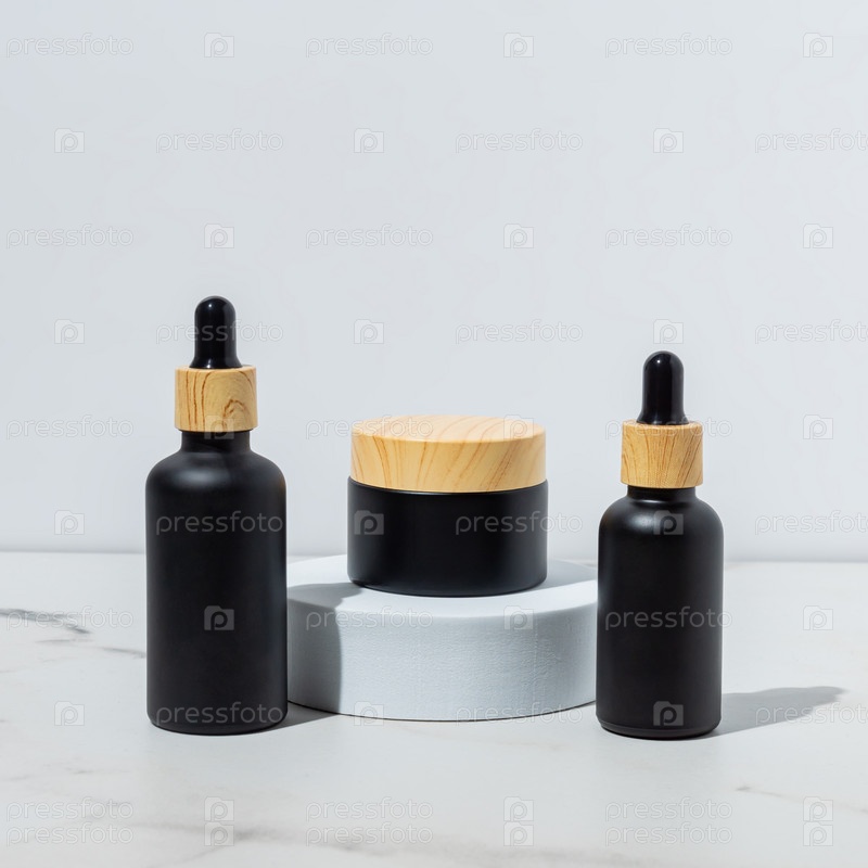Упаковка косметики. Набор различных косметических флаконов крема или сыворотки на белом подиуме. Пустая упаковка. Концепция продукта спа-салона природной красоты. Красота. Макет