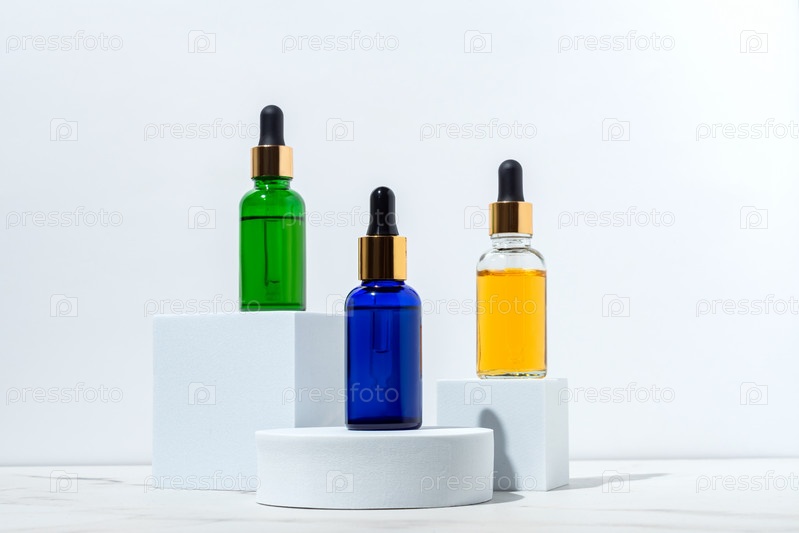 Бутылки с сывороткой для лица на белых подиумах на белом фоне. Косметический набор для домашнего ухода за кожей. Небрендовые бутылки для вашего дизайна