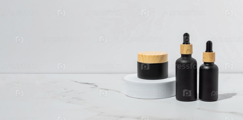 Антивозрастная коллагеновая сыворотка для лица в матовой черной бутылке и крем для лица на белом фоне с копией пространства. Натуральная органическая косметика. Макет для брендинга. Баннер