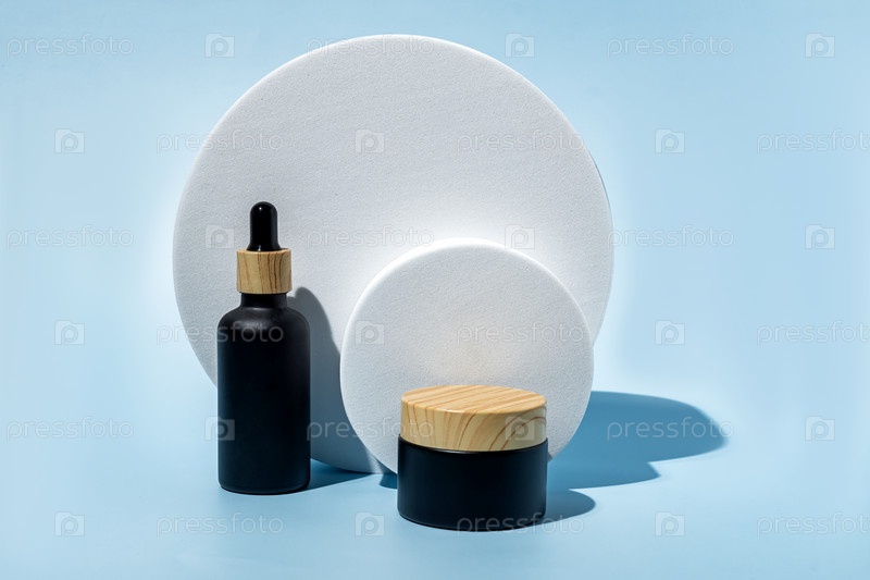 Естественная косметика в упаковке из бамбука и черного стекла на синем фоне с белым круглым подиумом. Набор органических косметических средств SPA. Концепция ухода за кожей