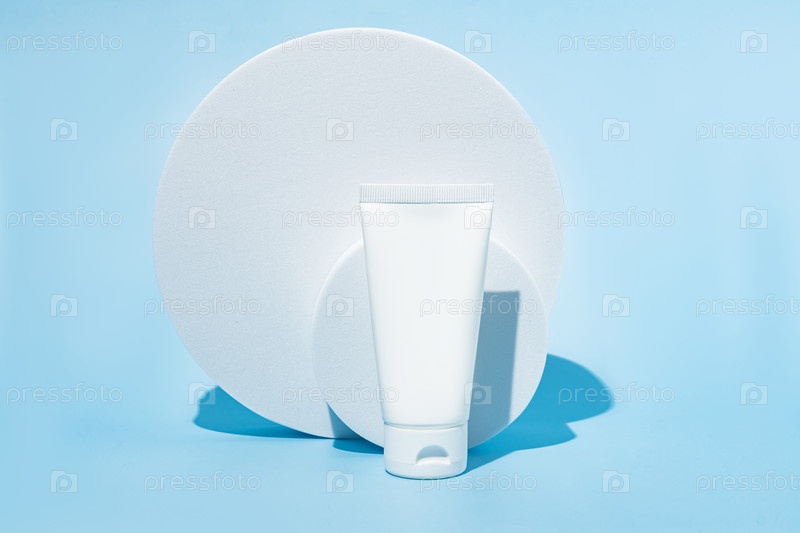 Пластиковая белая трубка на синем фоне с солнечными лучами. Очищающая косметика по уходу за кожей. Концепция красоты для ухода за телом лица