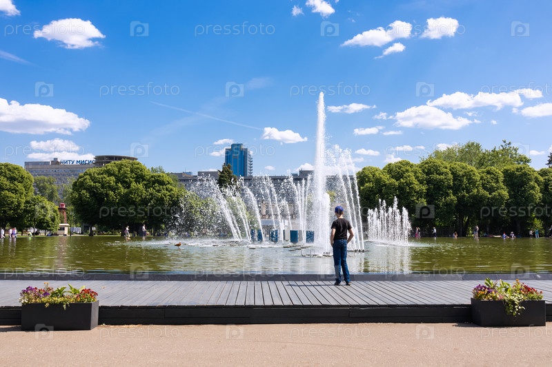 Подросток стоит спиной и смотрит на фонтан в солнечный летний день под синим небом