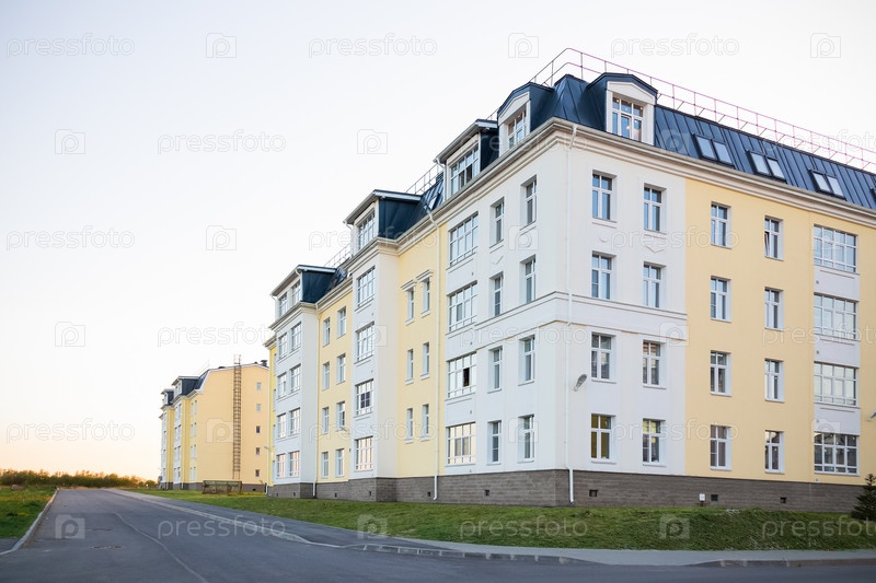 Четырехэтажный новый жилой дом на пустой улице