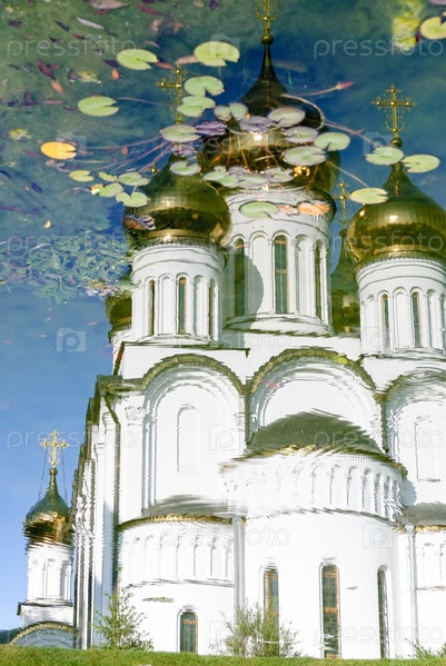 Переславль-Залесский, Россия - 1 сентября 2009 г.: Отражение в пруду собора Николая Чудотворца