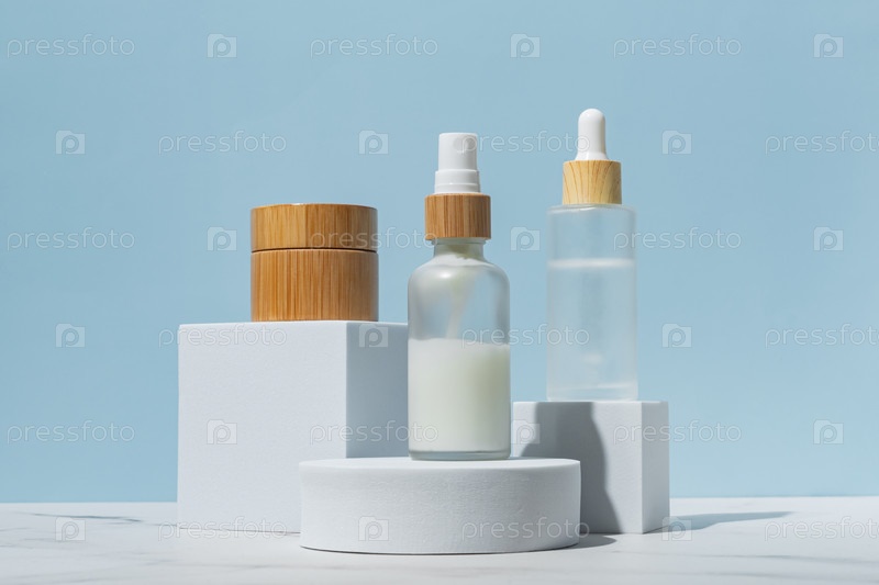 Набор косметических средств в стеклянных и бамбуковых бутылках на белых подиумах на синем фоне. Набор для ежедневного ухода за кожей. Мокап для дизайнеров