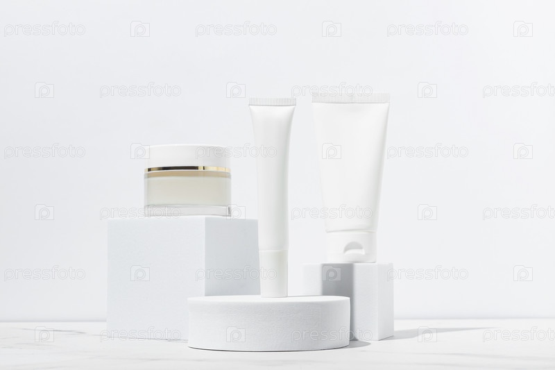 Упаковка косметики. Набор различных косметических баночек и тюбиков крема на белых подиумах. Пустая упаковка. Концепция продукта спа-салона природной красоты. Красота.Мокап