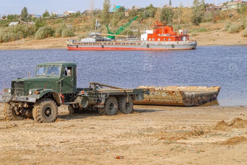 Тюмень, Россия - 19 сентября 2009 г.: Грузовик тянет модуль понтонного моста с реки Тура